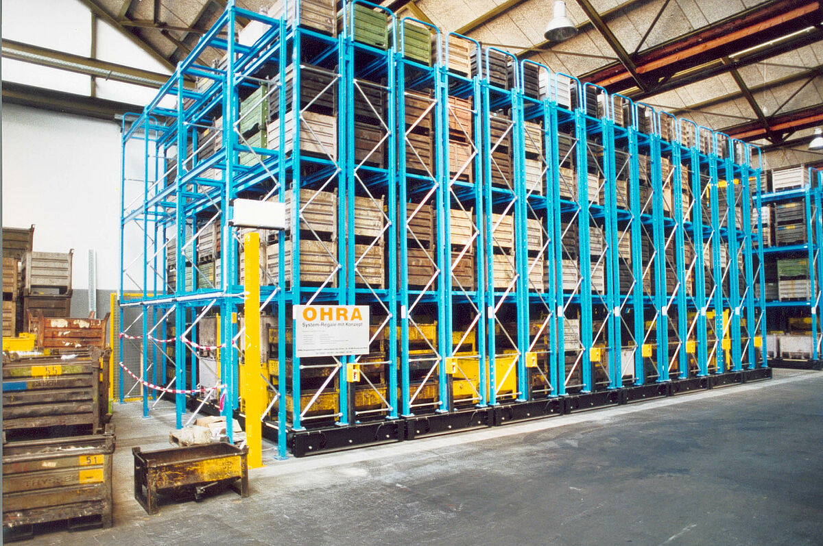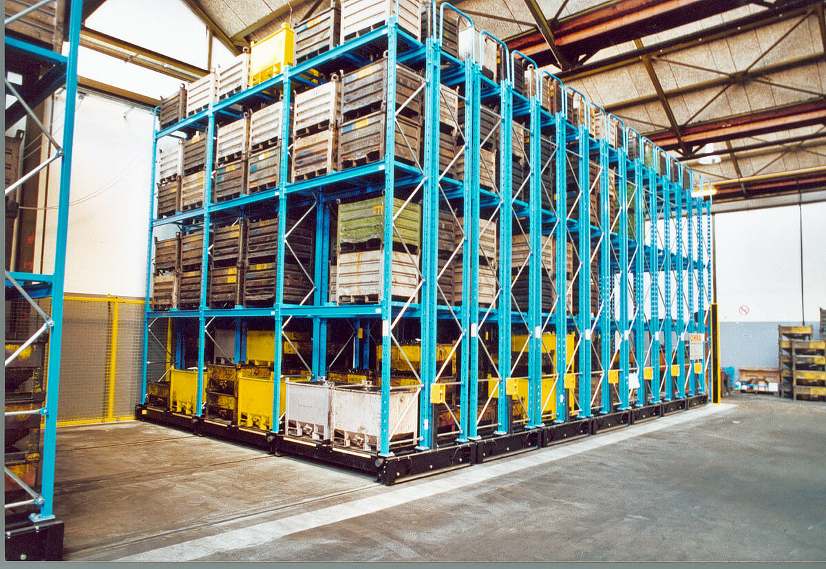 Tradycyjne systemy regałowe sa montowane na wózkach przesuwnych, zsuwanych za pomoca rolek. Do wprowadzania towarów na magazyn i wyprowadzania ich z magazynu odpowiednie przejscie, które jest wymagane, otwiera sie za pomoca elektronicznie sterowanego napedu.