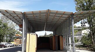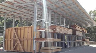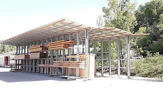 W tym celu OHRA zmontowała dwa 24-metrowe rzędy regałów wspornikowych. Oba ramiona wspornikowe i nogi regałów są skierowane na zewnątrz. Wsporniki regałów o wysokości 5,51 m podtrzymują również po obu stronach ramiona dachowe o długości 3,2 m. Regały są ustawione w taki sposób, że tworzą między sobą zadaszoną podłogową powierzchnię magazynową o szerokości około 6 metrów. Dzięki nogom regałów, które skierowane są wyłącznie na zewnątrz, można po niej bez problemu przejechać. Tu swoje miejsce znajdą prefabrykowane elementy ścienne. Na ścianach zewnętrznych ramiona wspornikowe o długości 1,2 metra i udźwigu 800 kilogramów tworzą trzy (lub cztery ze nogami regałowymi) również zadaszone poziomy składowania. Jest tu miejsce na belki i drewno konstrukcyjne.