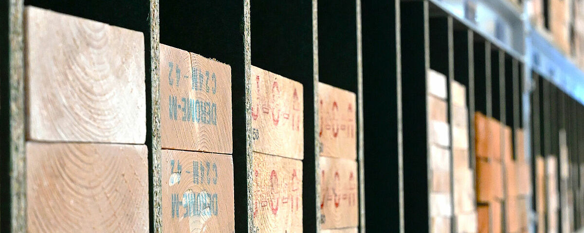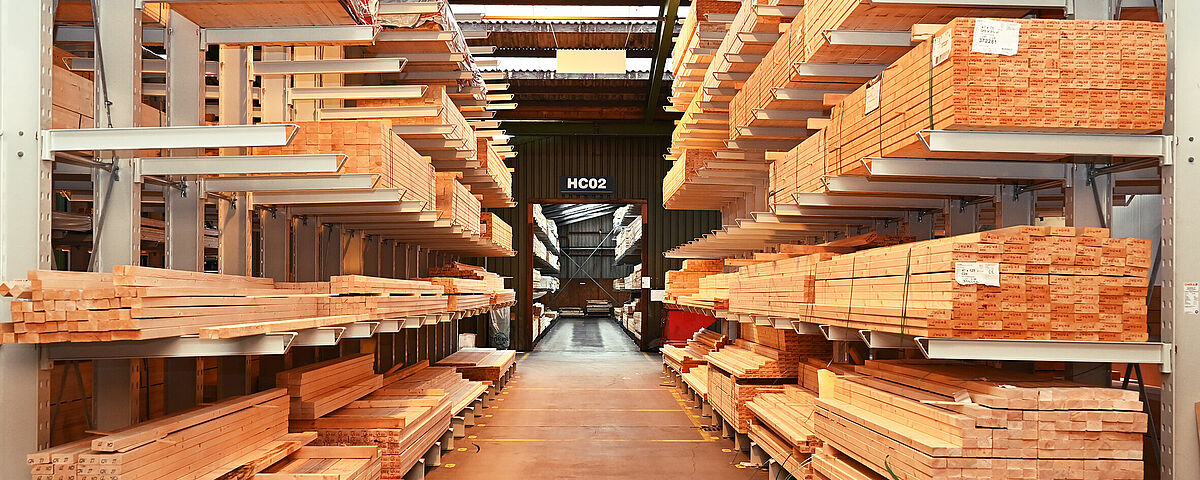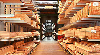 W celu zapewnienia przejrzystego magazynowania i zaprezentowania klientom dużej ilości różnych listew, łat i elementów konstrukcyjnych z drewna firma Brentjens uzupełniła regały wspornikowe o „regał wtykowy” o szerokości 12 m: W przypadku tej konstrukcji chodzi o dwa ustawione za sobą regały paletowe o wysokości 2,6 m. Ich ramy o głębokości 1 m są solidnie połączone ze sobą rozpórkami o długości 1 m. W ten sposób powstaje podwójny regał o głębokości półek wynoszącej 3 m.