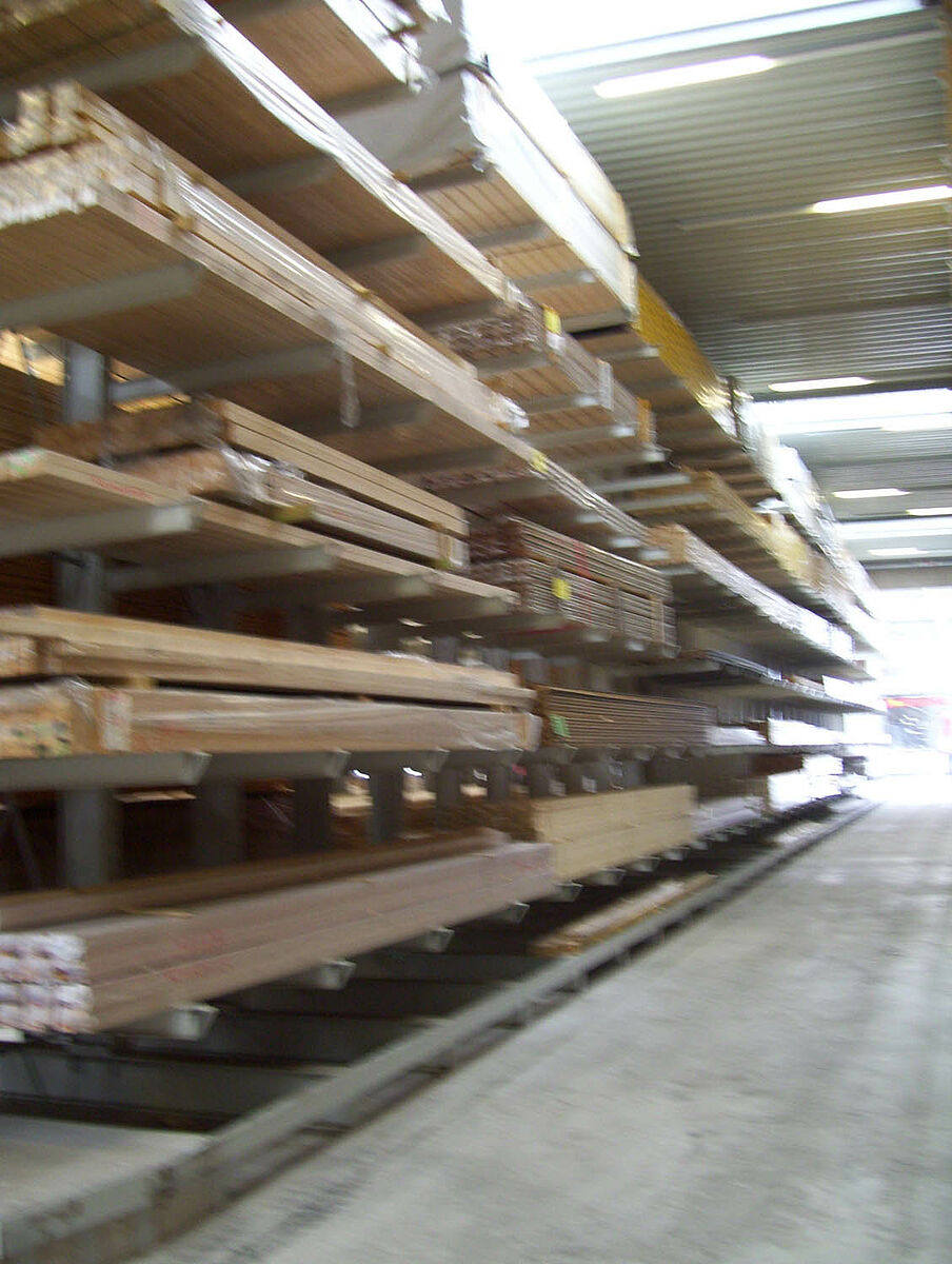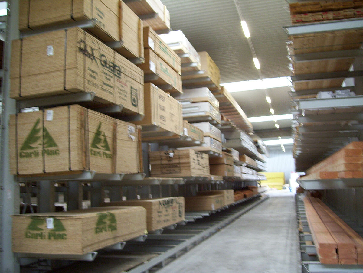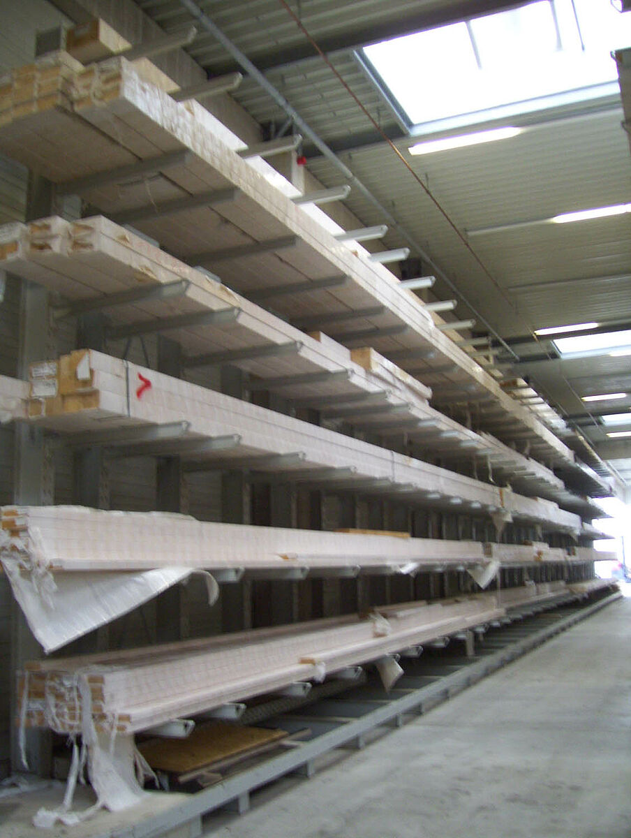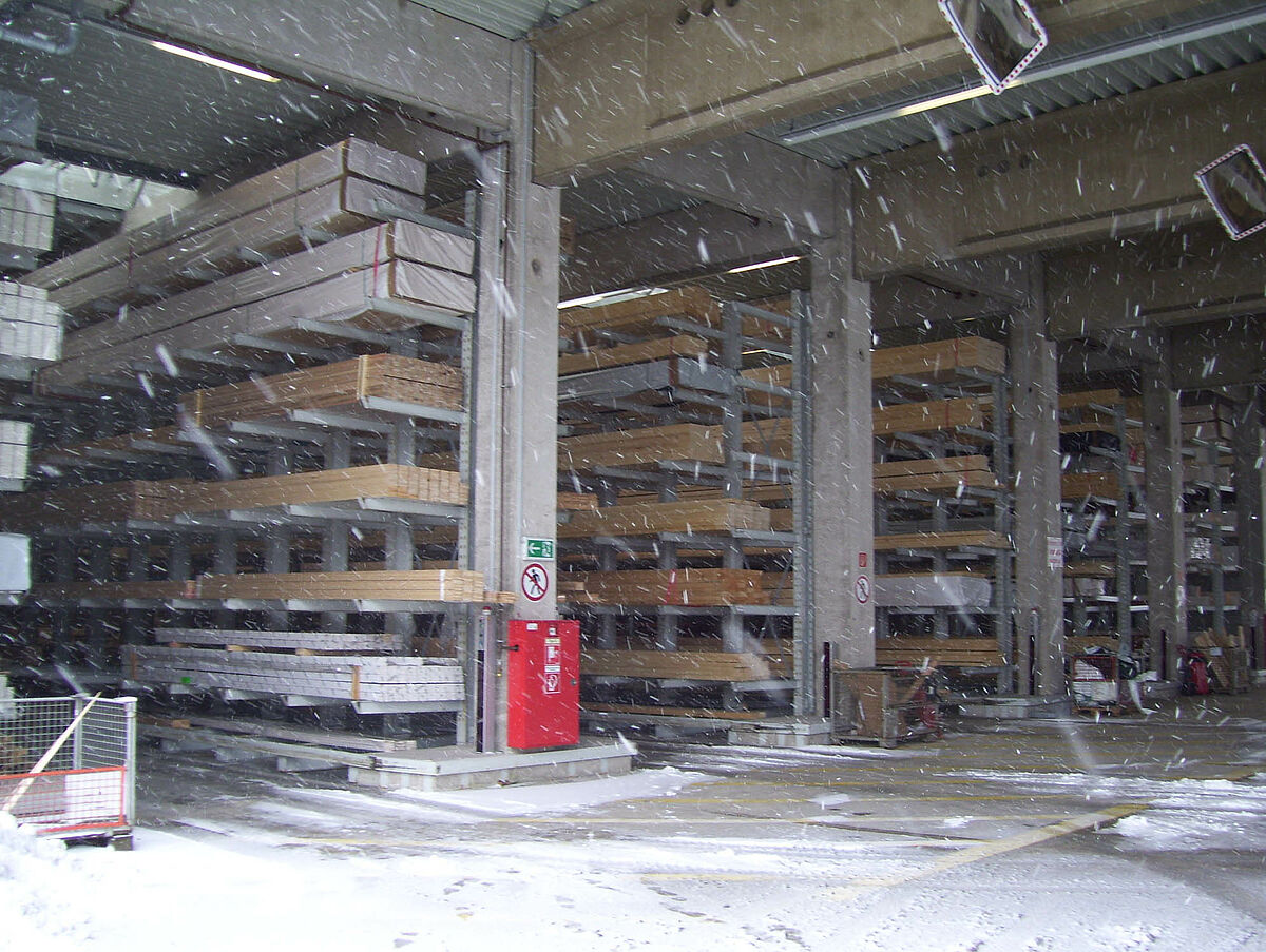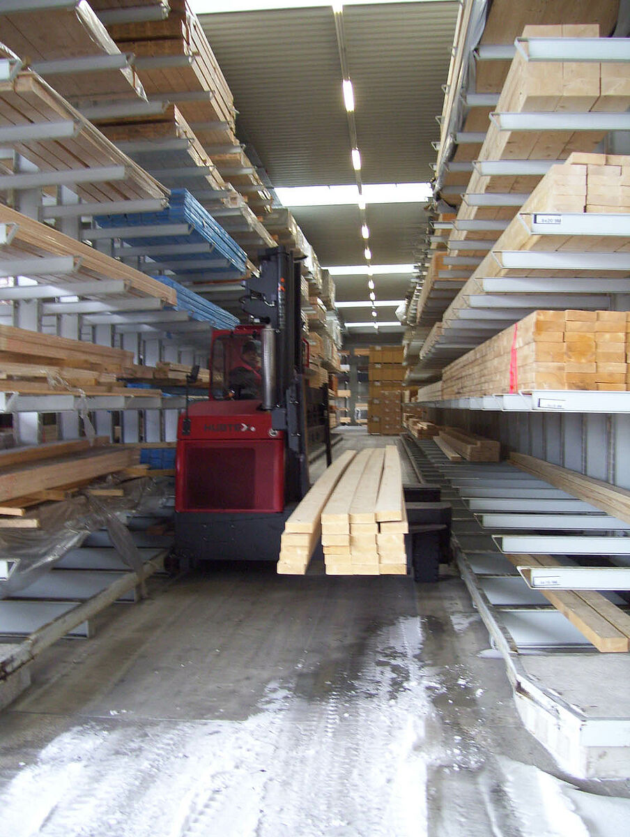 W jedynie dwa tygodnie fachowcy z Kerpen zmontowali 236 stanowisk magazynowych na lite drewno konstrukcyjne i klejone drewno laminowane w rzędach regałów wysięgnikowych o długości 409 i 50 metrów i wysokości 6,2 metra. Łącznie powstało w ten sposób 2.800 metrów bieżących regałów na długie elementy drewniane. Dodatkowo wykonano 300 miejsc do składowania na regałach paletowych i wysięgnikowych, na których magazynowane są towary na paletach oraz podstawowy asortyment. Magazyn jest obsługiwany przez dwa wózki widłowe Hubtex oraz jeden czołowy wózek widłowy Linde. Tylko w pierwszych sześciu miesiącach po uruchomieniu magazynu przetransportowano prawie 3.300 metrów sześciennych drewna.