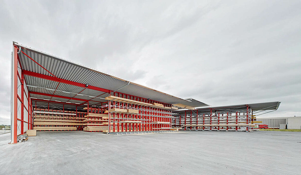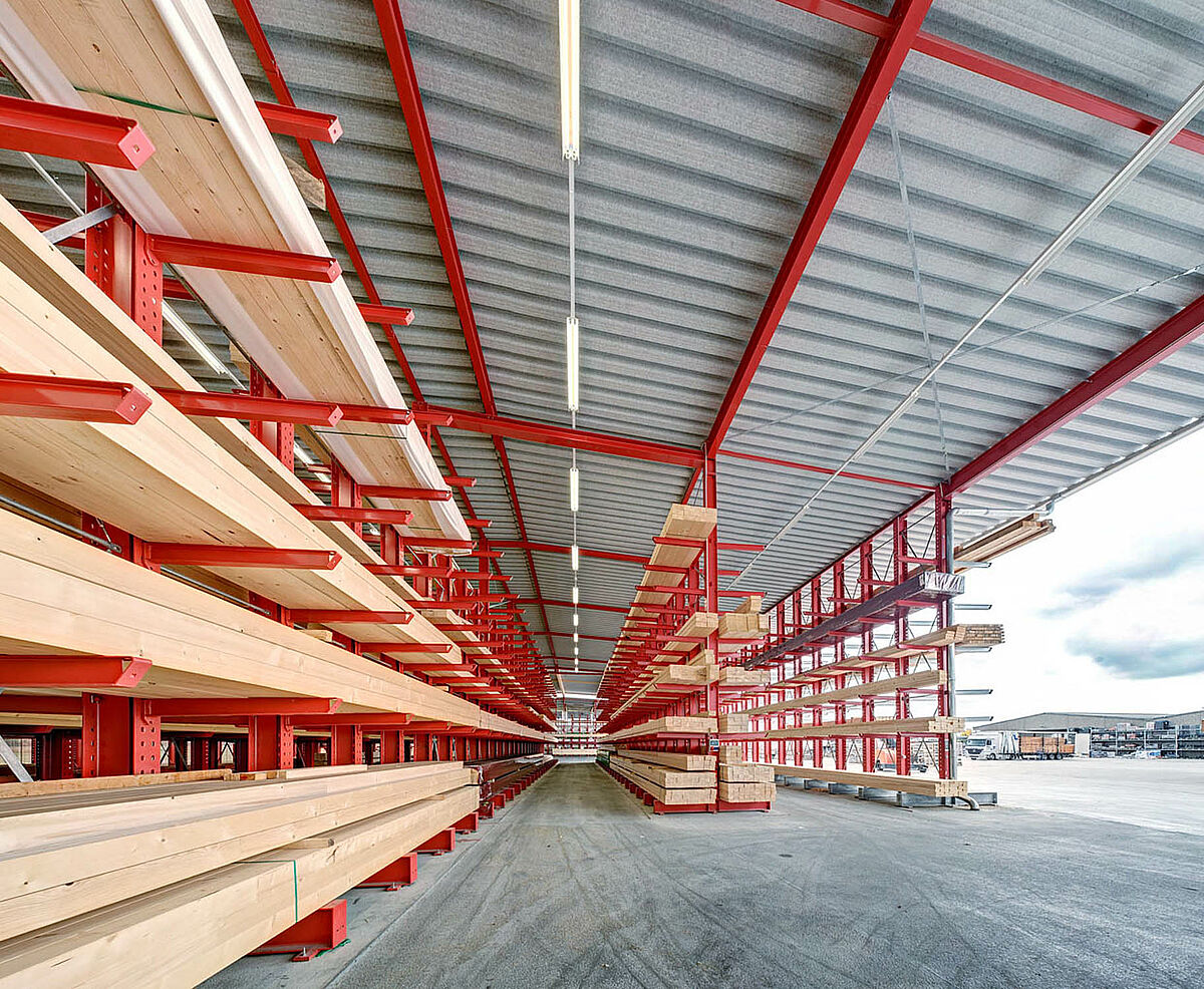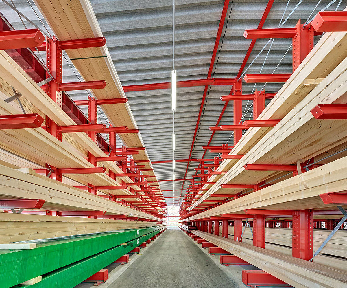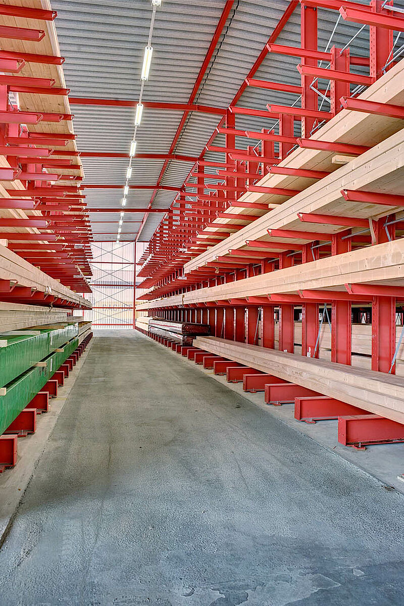 Dwustronne regały wspornikowe mają 8.600 mm wysokości i oferują 6 poziomów składowania z każdej strony. Przy nośności jednego wspornika 800 kg można przykładowo umieścić na jednym poziomie składającym się z 33 stojaków 26,4 T materiału. Całkowita wymagana powierzchnia pod nowy magazyn drewna wynosi 3.100 qm. Wysokość kalenicy wynosi 9.750 mm. Godne uwagi jest tutaj, że została wybrana przez klienta konstrukcja dachu, jako kombinacja stali i wiązarów klejonych. Rozpiętość wynosi ok. 21,0 m. Dzięki własnemu wkładowi pracy, klient mógł poczynić oszczędności przy tej realizacji.