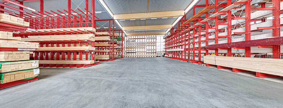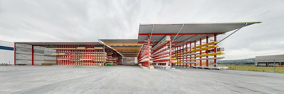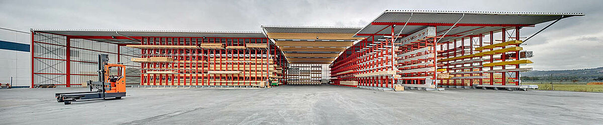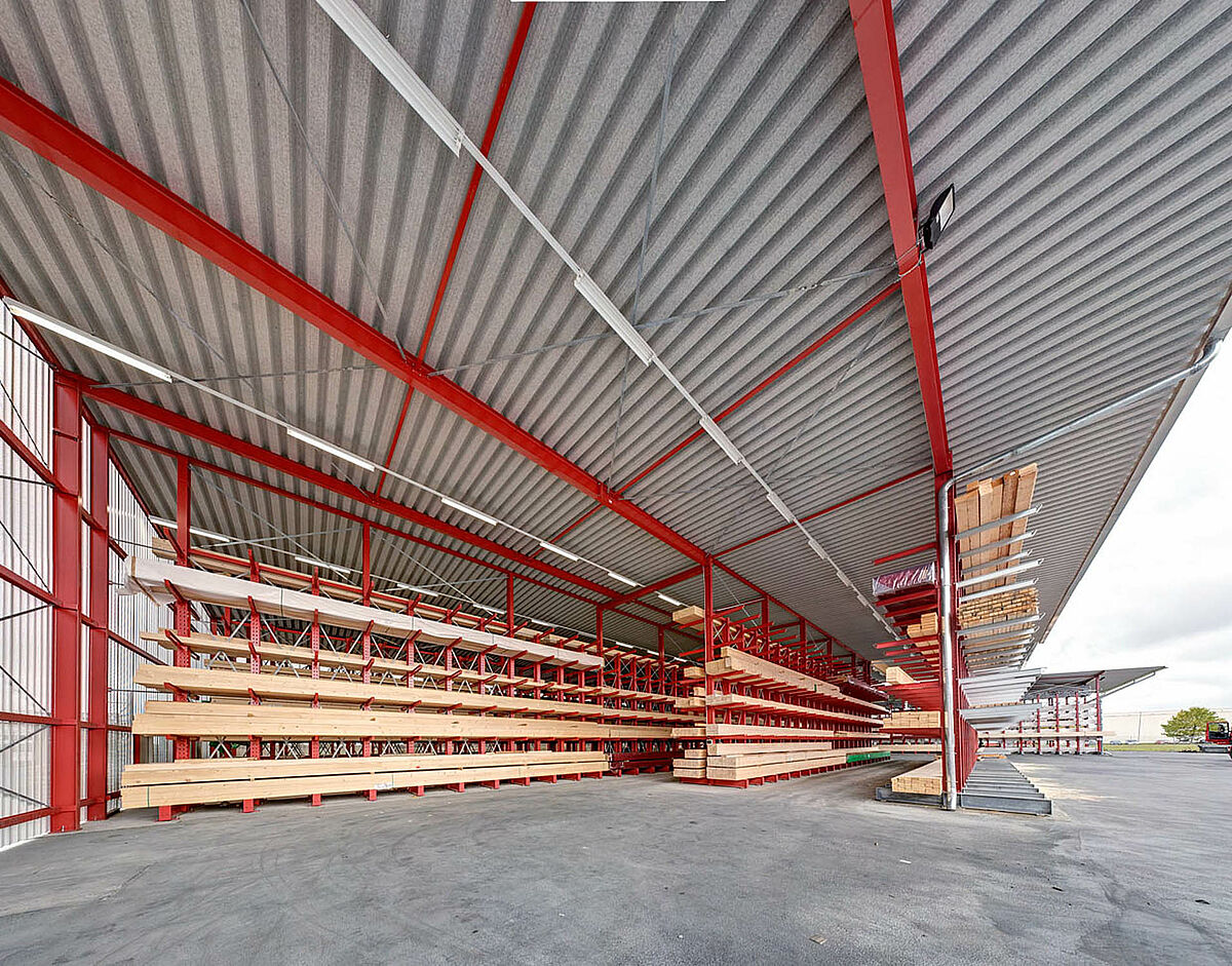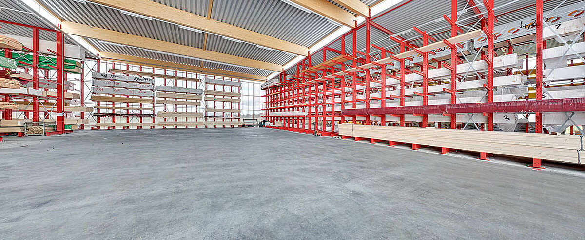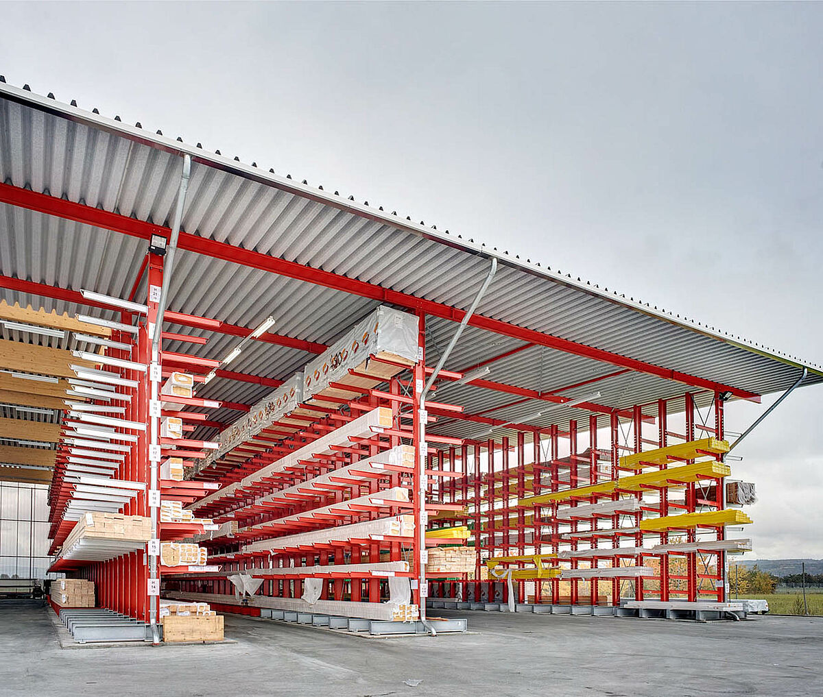 Dwustronne regały wspornikowe mają 8.600 mm wysokości i oferują 6 poziomów składowania z każdej strony. Przy nośności jednego wspornika 800 kg można przykładowo umieścić na jednym poziomie składającym się z 33 stojaków 26,4 T materiału. Całkowita wymagana powierzchnia pod nowy magazyn drewna wynosi 3.100 qm. Wysokość kalenicy wynosi 9.750 mm. Godne uwagi jest tutaj, że została wybrana przez klienta konstrukcja dachu, jako kombinacja stali i wiązarów klejonych. Rozpiętość wynosi ok. 21,0 m. Dzięki własnemu wkładowi pracy, klient mógł poczynić oszczędności przy tej realizacji.