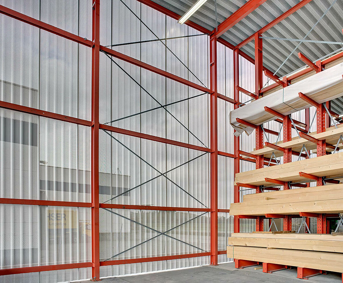 Oczywistym jest, że kompletna konstrukcja została pomalowana na życzenie klienta w kolorze firmowym RAL 3000. Stopy regałów zostały dostarczone w wersji ocynkowanej ogniowo tak, aby także przy intensywnych opadach nie dopuścić do rdzy. Na końcu zostały wykonane boczne i tylne ściany przy pomocy dziurkowanej blachy trapezowej. Dzięki specjalnym podziałom otworów, blacha ta jest z jednej strony odporna na opady i wiatr, z drugiej strony przepuszcza światło i pozwala oddychać.