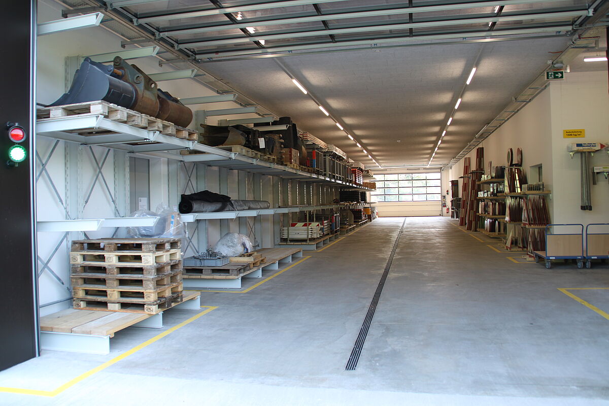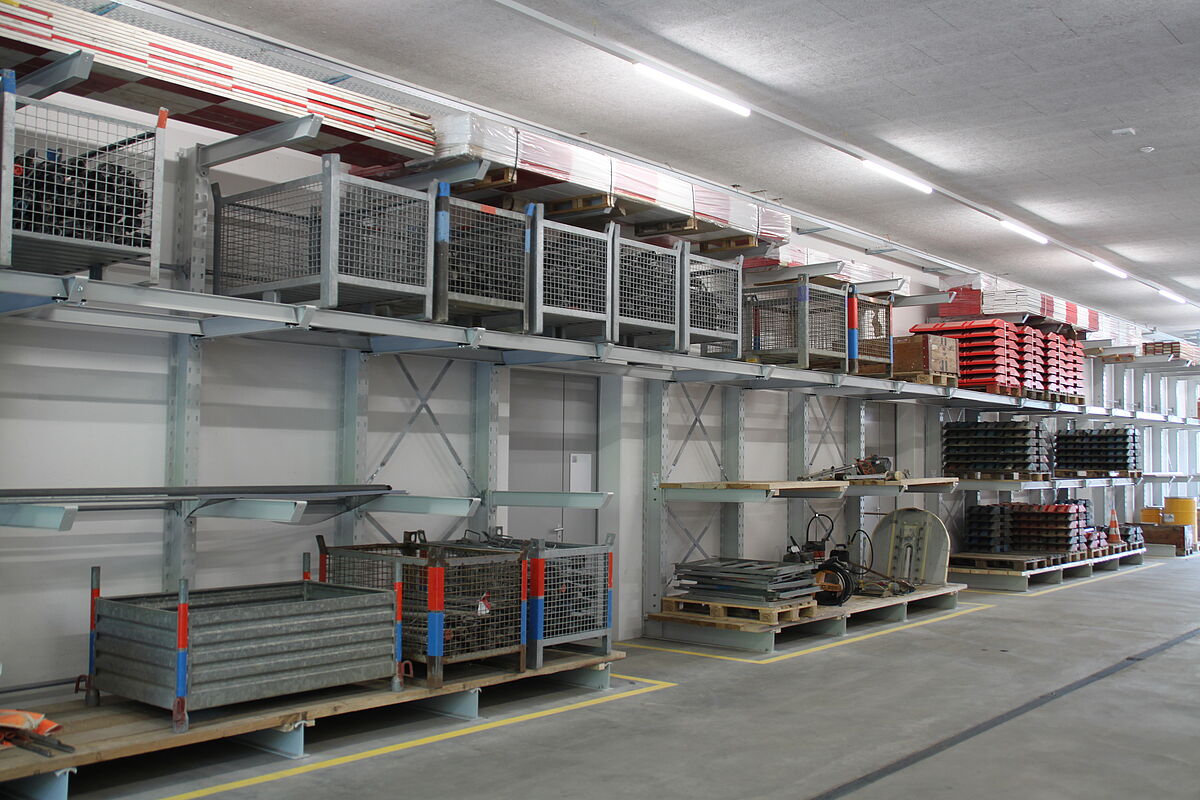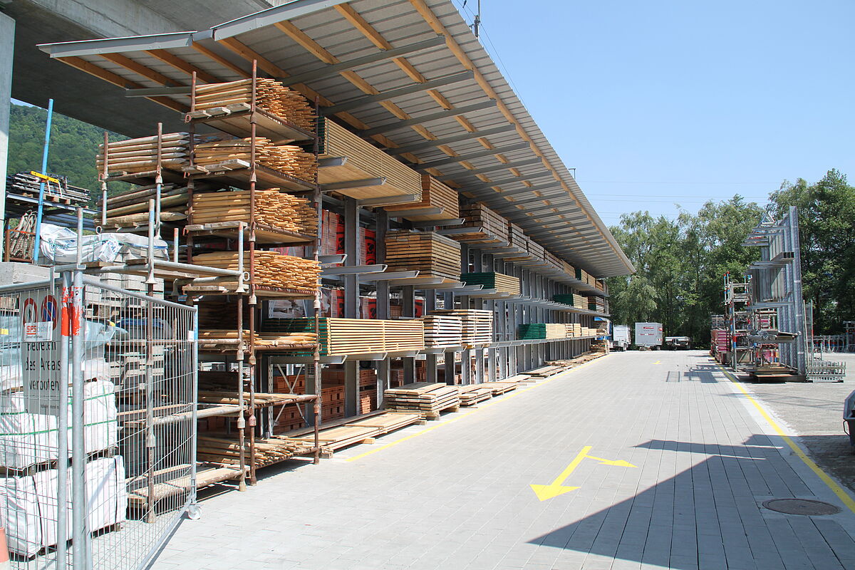 Od początku 2018 roku zakład Gottlieb Müller w Rothrist służył jako platforma operacyjna dla projektów budowlanych i inżynieryjnych firmy. Aby móc efektywnie przechowywać różnorodne materiały budowlane i zapasy magazynowe, firma Gottlieb Müller zdecydowała się na zastosowanie dwóch rodzajów regałów: Magazyn jest zasadniczo wyposażony w 16 regałów paletowych o wysokości 3,5 m i długości 8,45 m. Na każdym regale znajdują się trzy europalety lub kratownice o wadze do 1000 kg każda. Dodatkową powierzchnię magazynową w hali zapewnia siedem jednostronnych regałów wspornikowych o wysokości 3,64 m. Niektóre z nich posiadają mosty ramionowe i regały półkowe, dzięki czemu oprócz długich towarów, takich jak rury lub płyty, można bez ograniczających podpór składować różnego rozmiaru środki pomocnicze do załadunku. Kolejne regały wspornikowe zostały zainstalowane na zewnątrz i są one zabezpieczone przed korozją dzięki procesowi cynkowania ogniowego. Dominuje tu rząd regałów o długości 43,5 m, których najwyższe wsporniki są zaprojektowane jako ramiona dachowe: Utrzymują one po obu stronach 2,7-metrowy, lekko pochylony dach. Składowane w ten sposób materiały budowlane z drewna są chronione przed bezpośrednim wpływem opadów atmosferycznych. Wsporniki wszystkich regałów mają nośność 1200 kg na jedno ramię.