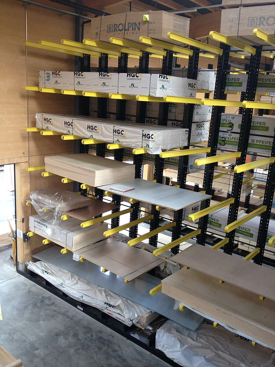 Regały OHRA są dostosowane nie tylko, dzięki swoim wymiarom, nośności i dodatkowemu wyposażeniu, dokładnie do towarów oferowanych przez HGC, ale są również wykonane w barwach przedsiębiorstwa. Słupy i ramy zostały polakierowane na kolor czarny (RAL 9017), półki i ramiona wysięgnikowe na żółto (RAL 1018). Dzięki temu w każdym miejscu magazynu, z którego klienci odbierają towary, podkreślony jest corporate design przedsiębiorstwa handlowego.