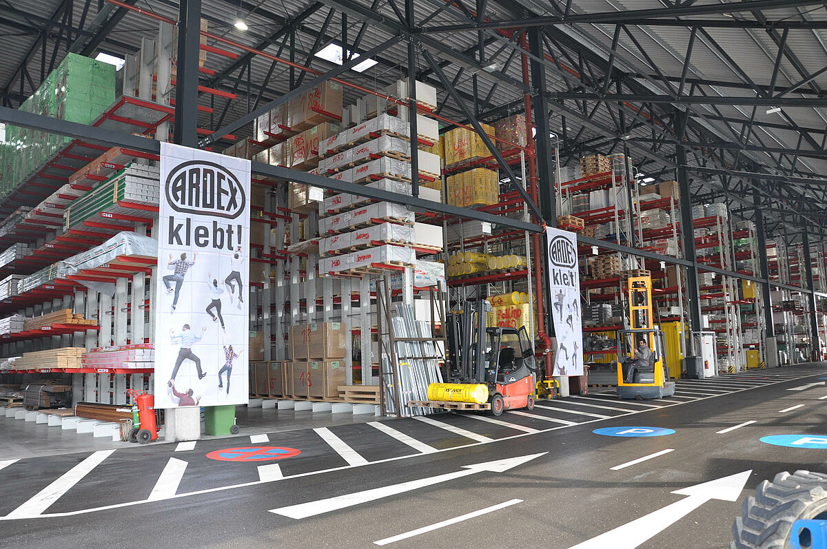 Aby zapewnić tym tak różniącym się między sobą artykułami najwięcej miejsca, półki w regałach paletowych zostały wykonane w różnych szerokościach w zakresie od 2.200 do 4.000 milimetrów. Obciążenie wynosi od 3.000 do 4.800 kilogramów. Na siedmiu poziomach magazynowych, z których najwyższy znajduje się na wysokości 9 metrów, jest miejsce na prawie 7.000 palet. Długie produkty są składowane na ścieżkach regałów wysięgnikowych o długości 28,5 metra. Regały są wyposażone w ramiona wysięgnikowe o długości 1.200 milimetrów; każde z nich może unieść do 800 kilogramów. Ramiona wysięgnikowe regałów OHRA są zawieszane poziomo na wspornikach, a nie skręcane lub spawane. Dzięki temu zawieszone ramię pozostaje elastyczne i odchyla się w razie uderzenia. Wsporniki regałów są wykrawane w siatce 100 milimetrów i mogą być w ten sposób szybko dostosowane do zmieniających się potrzeb magazynowych – i to bez narzędzi.