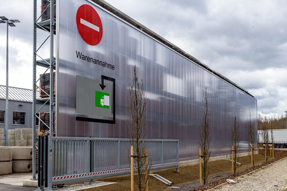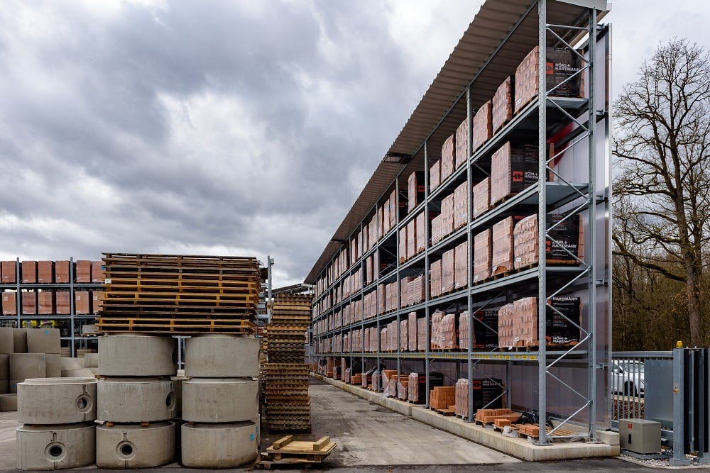 Firma Kraft Baustoffe, według własnych danych największy obecnie dystrybutor materiałów budowlanych w rejonie Monachium, zrealizowała na wolnym powietrzu magazyn swojej nowej filii w Höhenkirchen-Siegertsbrunn z regałami paletowymi i wspornikowymi firmy OHRA. Regały posiadają nie tylko zadaszenie, ale – ponieważ konieczne było wdrożenie surowych przepisów dotyczących izolacji akustycznej – posiadają również tylną okładzinę ściany, która służy jako element ochrony przed hałasem.