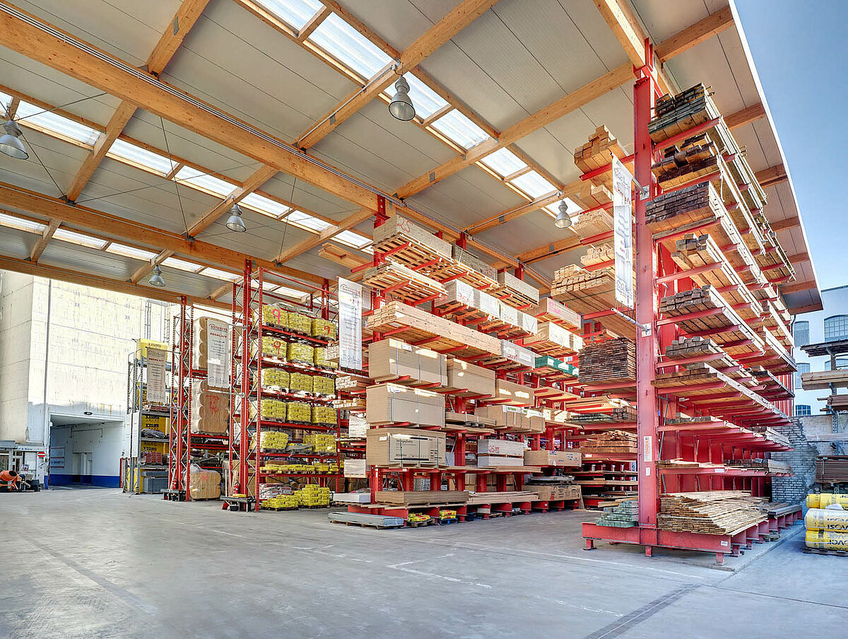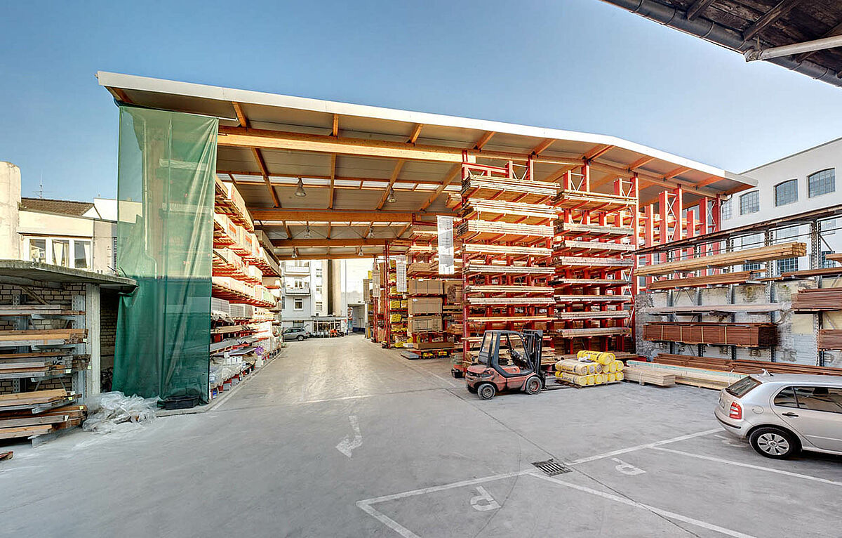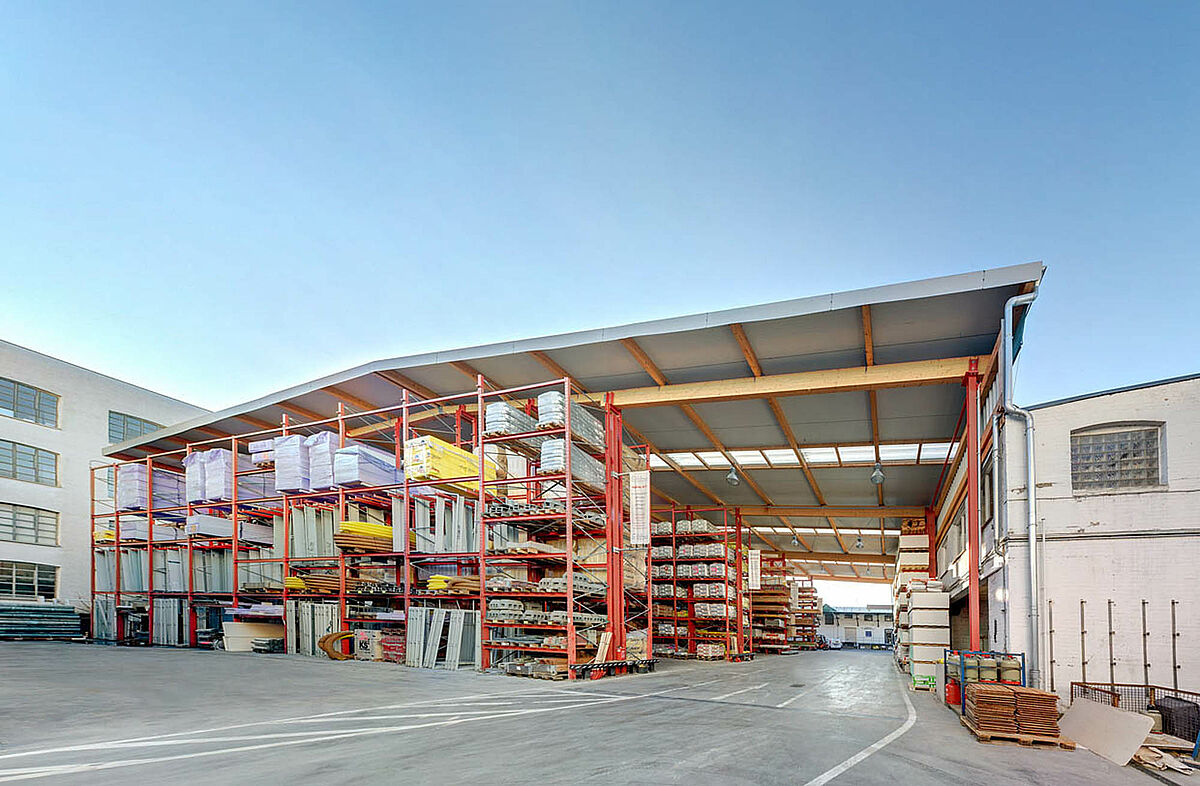 Nowa zbudowana na regałach hala jest „specjalnością” firmy OHRA. Słupy ram regałów wspornikowych i paletowych oprócz funkcji regałowej, służą zarazem jako konstrukcja nośna przekrycia dachowego i ścian. W tym wypadku dwa niosące dach regały paletowe i wspornikowe o wysokości 9.500 mm wspierają całą konstrukcję. Dodatkowo zrealizowano wystające na 10,0 m zadaszenie, przekrywające miejsca załadowcze. Samo zadaszenie jako klejona konstrukcja drewniana, zostało wykonane przez inwestora.