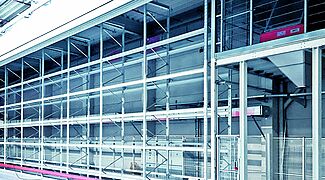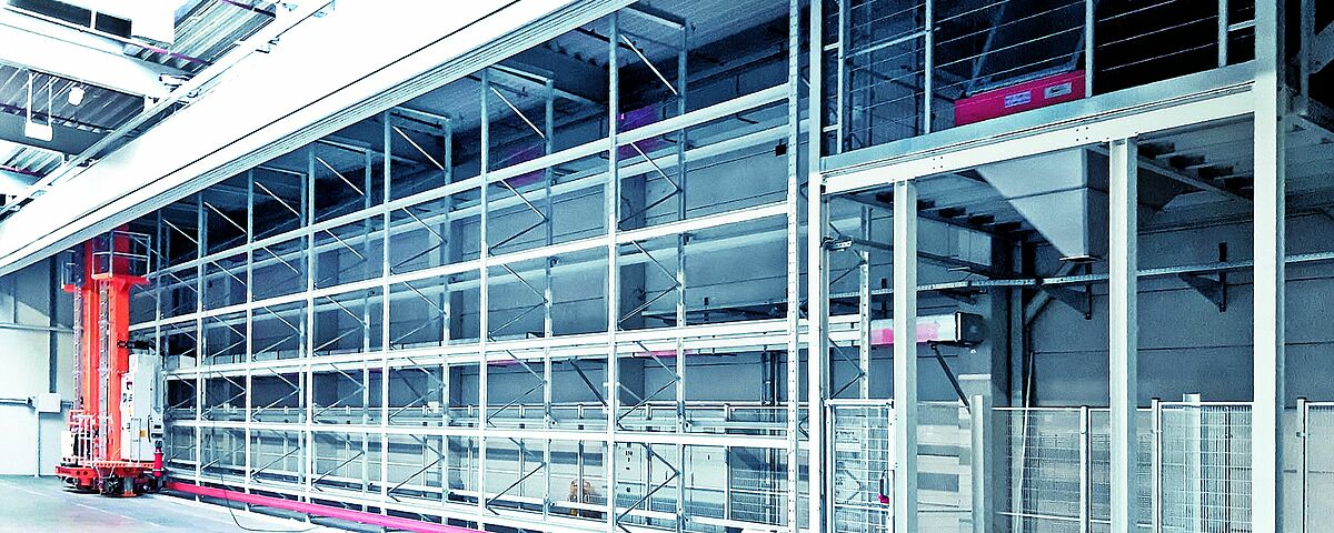 Z myślą o strefie składowania OHRA dostarczyła i zamontowała regał paletowy o długości 27,3 m, który pomieści ok. 100 zbiorników o wadze do 600 kg. Bezpośrednio z regałem połączona jest stalowa platforma konstrukcyjna, również dostarczona przez firmę OHRA. Zainstalowane jest na nim urządzenie wywracające, za pomocą którego nasiona transportowane przenośnikami taśmowymi lub podnośnikiem czerpakowym są ładowane do znajdujących się poniżej zbiorników magazynowych. Zbiorniki są następnie pobierane i składowane przez urządzenie do obsługi regałów firmy Köttgen, która – podobnie jak OHRA – należy do grupy Hölscher. W tym celu konsole i szyna prowadząca urządzenia do obsługi regałów są poprowadzone na całej długości systemu. W ten sposób regał i platforma stanowią jedność. Zapewnia to bezproblemowy transport zbiorników z urządzenia wywracającego do przestrzeni na regale.