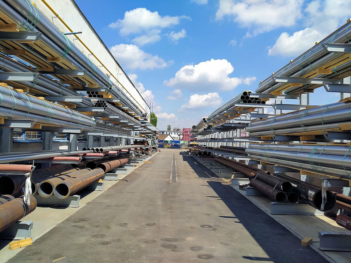 System regałowy firmy OHRA przekonuje przede wszystkim swoją solidnością i stabilnością: Ponieważ firma OHRA produkuje wszystkie elementy nośne regałów wyłącznie z litych profili stalowych, gwarantują one wysoką nośność i jednocześnie smukłą konstrukcję. Ponadto firma OHRA dostosowała regały dokładnie do potrzeb firmy Mebatex, tak aby poszczególne rury mogły być bezpiecznie i efektywnie magazynowane. Firma OHRA zamontowała na zewnątrz dwa rzędy jednostronnych regałów wspornikowych o łącznej długości ponad 92 metrów.