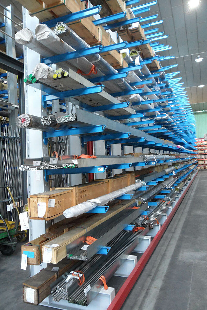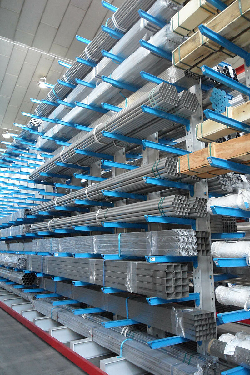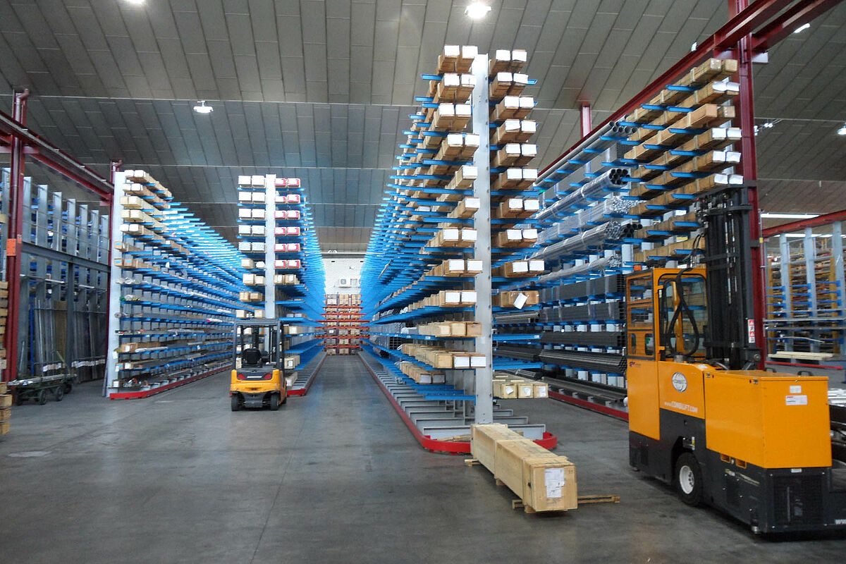 Magazyn z regałami wysięgnikowymi do handlu stalą szlachetną