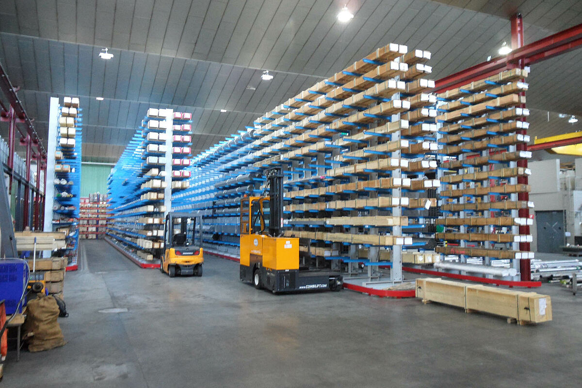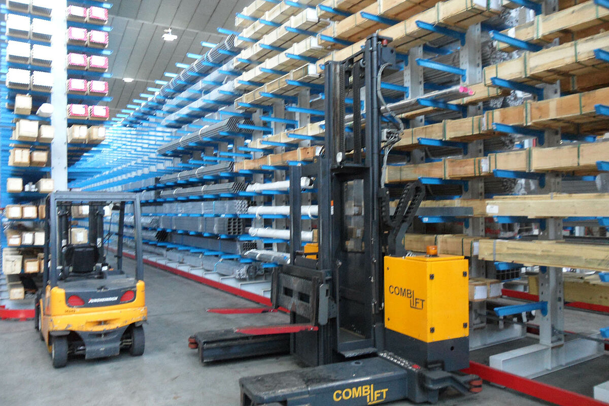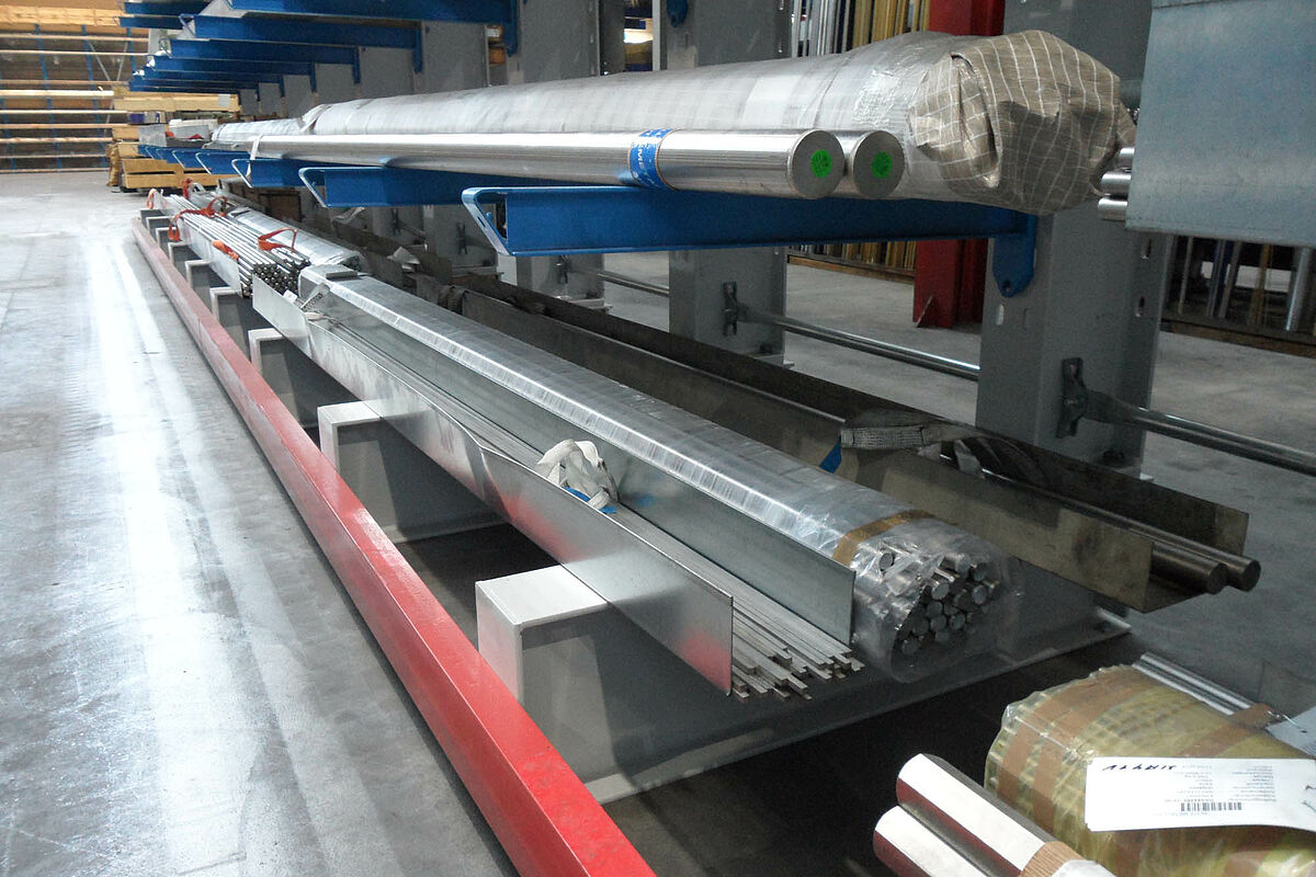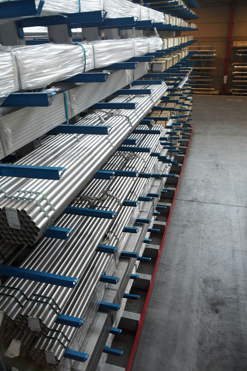 Magazyn z regałami wysięgnikowymi do handlu stalą szlachetną