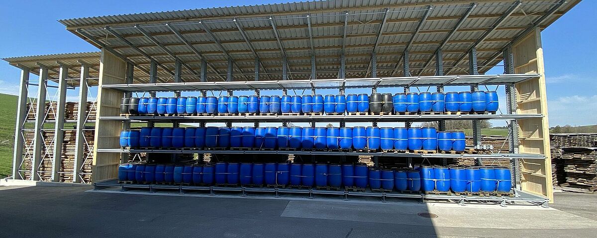 Wszystkie poziomy regałów są wyposażone w kratowane półki, dzięki czemu wszystkie rodzaje towarów mogą być przechowywane w elastyczny sposób, niezależnie od nośnika ładunku lub pomocy ładunkowych. Kratowane półki zapewniają również dobrą wentylację przechowywanych artykułów i dobrą widoczność podczas przechowywania i pobierania. Na krawędziach stojaków zamontowane są trzymetrowe ramiona dachowe o nachyleniu 11 stopni. Obszerny dach niezawodnie chroni przechowywane towary przed warunkami atmosferycznymi. Obciążenia w związku z wiatrem i śniegiem występujące przy tak dużej powierzchni dachu zostały oczywiście uwzględnione w obliczeniach statycznych regału.