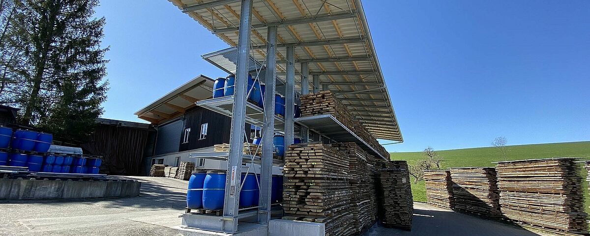 Stromy teren i niewielka ilość miejsca sprawiły, że projektowanie nowego systemu regałów zewnętrznych dla stolarni Nyfeler Holzwaren AG było szczególnie wymagające. Firma OHRA podzieliła ostatecznie dwustronny regał wspornikowy na stronę wschodnią i zachodnią, które mimo różnych wysokości półek i przesuniętej względem siebie konstrukcji są chronione przez wspólny dach o głębokości sześciu metrów. Firma Nyfeler zyskuje dzięki regałowi znacznie więcej przestrzeni magazynowej, oszczędza czas przy składowaniu i pobieraniu towarów, a dzięki ochronie przed bezpośrednimi wpływami atmosferycznymi składowane towary są w mniejszym stopniu narażone na uszkodzenia.