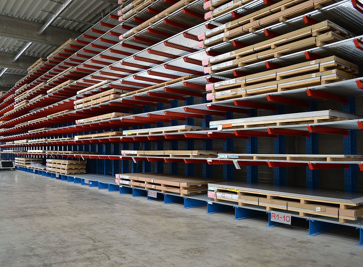 Łącznie siedem jednostronnych regałów wspornikowych o długości od 3,6 do 76,5 metra stoi dziś w nowoczesnej hali produkcyjnej firmy Ronge Profil. Na łącznie dziesięciu poziomach magazynowania – najwyższym na wysokości 6800 milimetrów – zapewniają one wystarczającą pojemność do elastycznego zaopatrzenia produkcji w niezbędną blachę. Podwójne obłożenie nie jest już wymagane – zmniejsza to nakład pracy i koszty magazynowania i pobierania blachy.