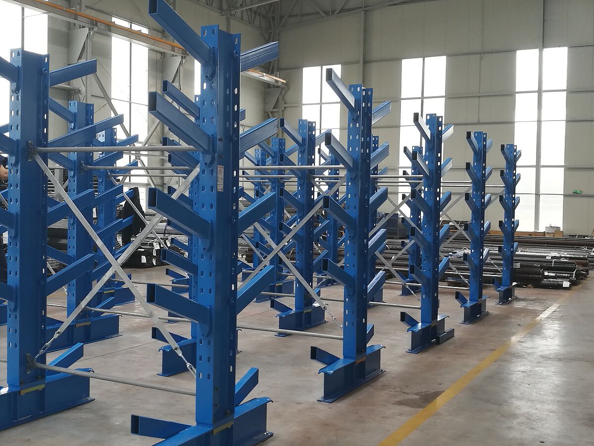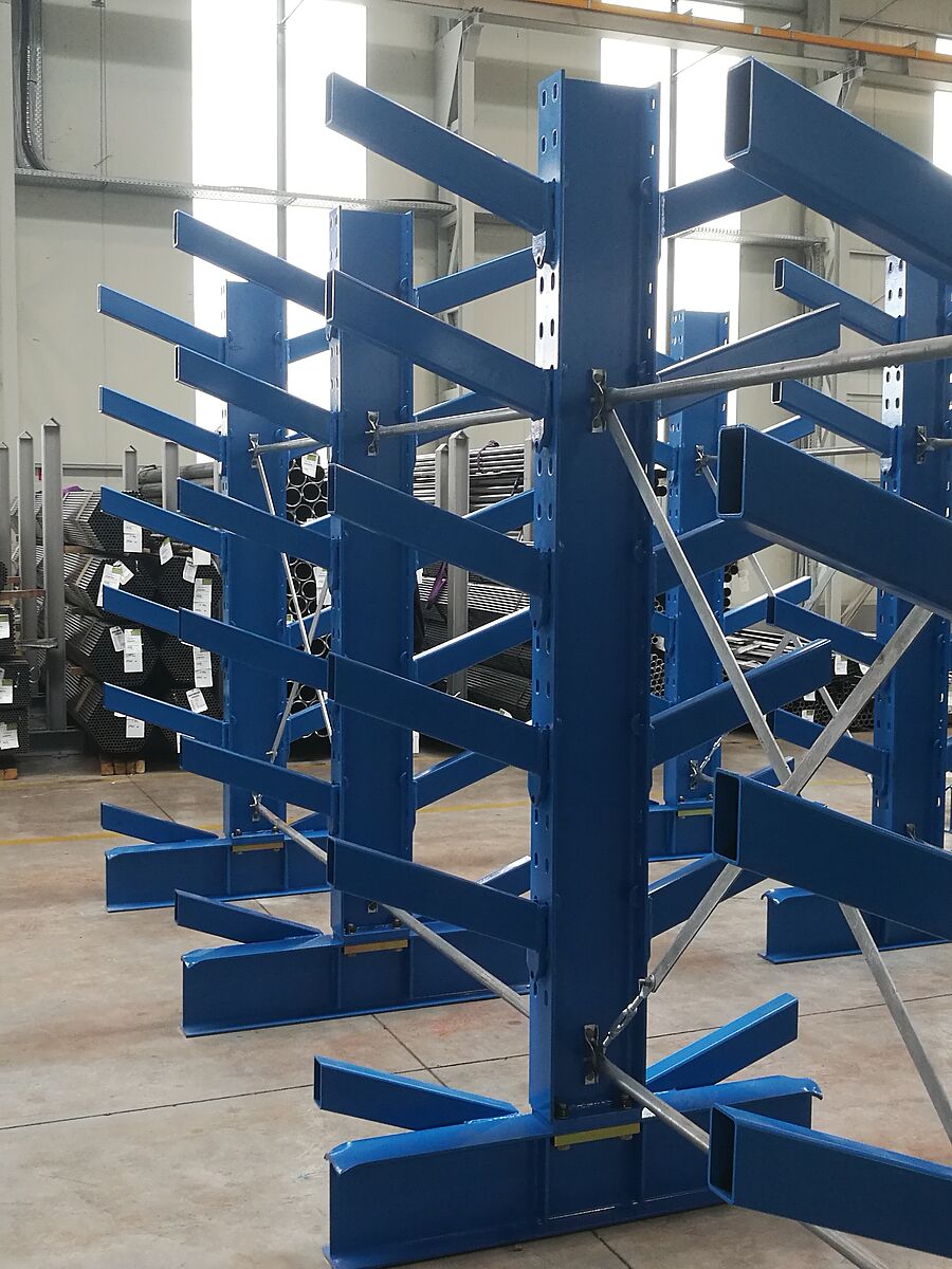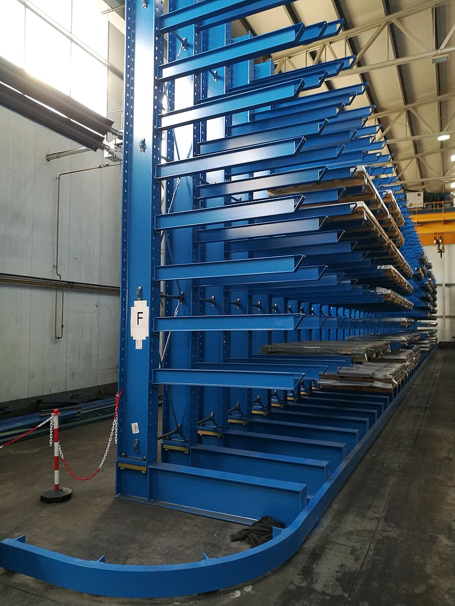 W drugiej strefie magazynowania OHRA zainstalowała dodatkowo siedem rzędów regałów z ramieniem ukośnym. W tej strefie za pomocą dźwigu składowane są rury, profile i pręty. W przypadku tego typu regałów przygotowano wsporniki z ukosem 20°. Pakiet towarów długich jest wsuwany na przewidzianą półkę, a proces składowania został znacznie ułatwiony poprzez zastosowanie dźwigu. Również w przypadku regału z ramieniem ukośnym ramiona zostały podwieszone. Zastosowane w thyssenkrupp Materials regały mają wysokość 2,5 metra i oferują siedem poziomów składowania towarów o długości do 6000 mm. Nośność ramion o długości 500 mm wynosi 800 kilogramów.
